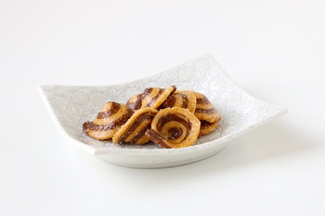 うず巻模様のかりんとう。砂糖と蜜の程よい甘味と、サクサクした生地の旨味が堪能できます。